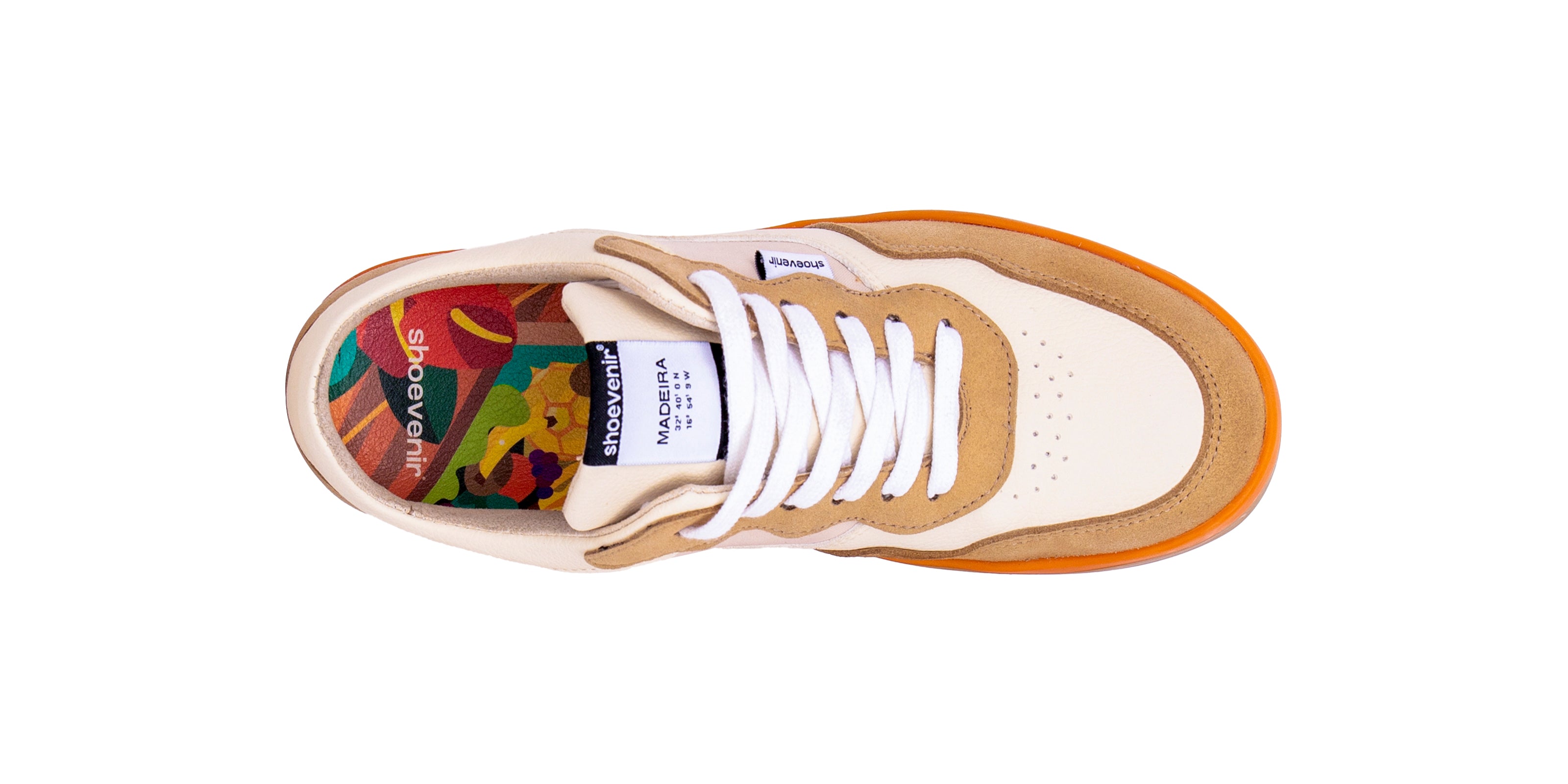 The Shoevenir uses 100% recyclable synthetic rubber, vegan suede, vegan leather, recycled cork, and recycled polyester.
