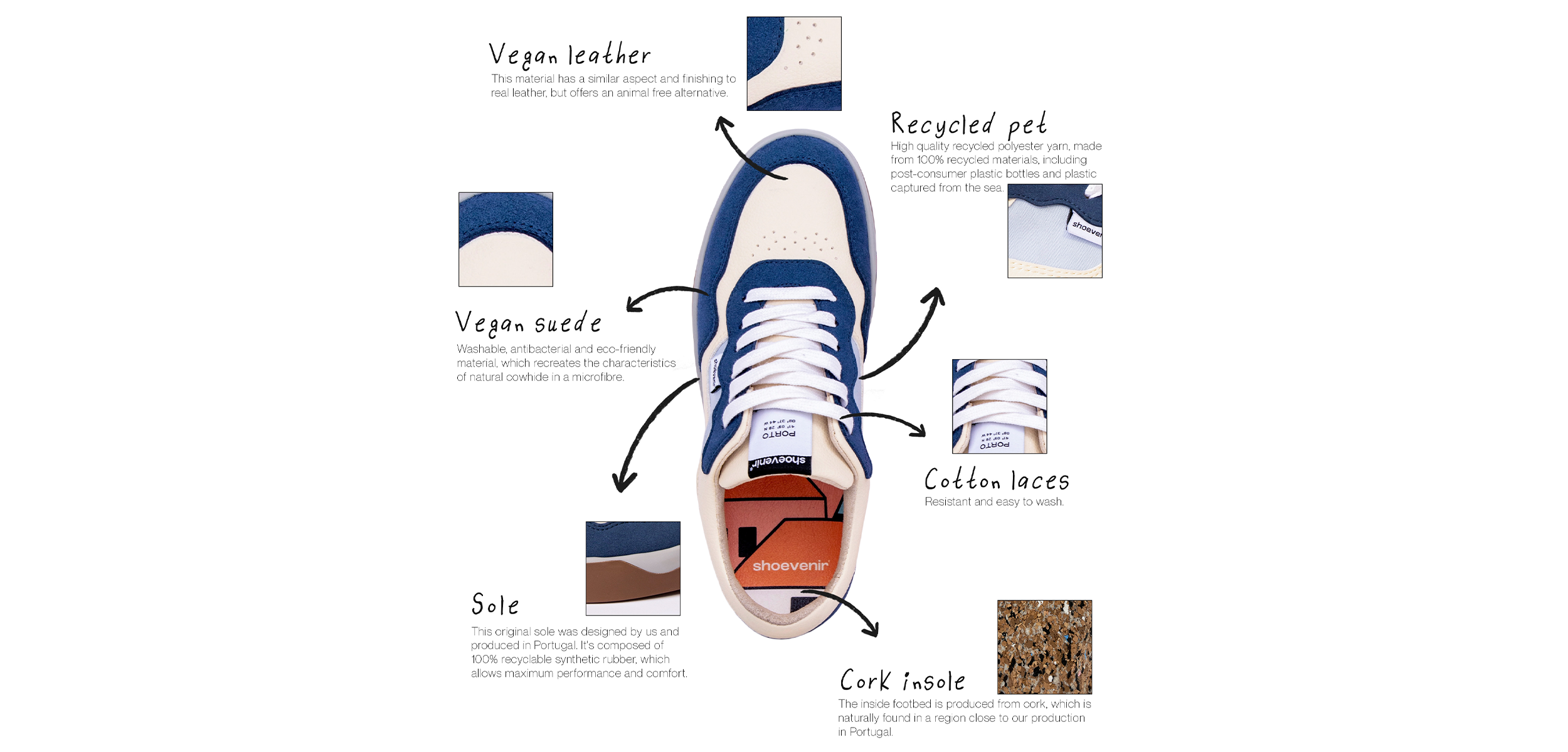 The Shoevenir uses 100% recyclable synthetic rubber, vegan suede, vegan leather, recycled cork, and recycled polyester.